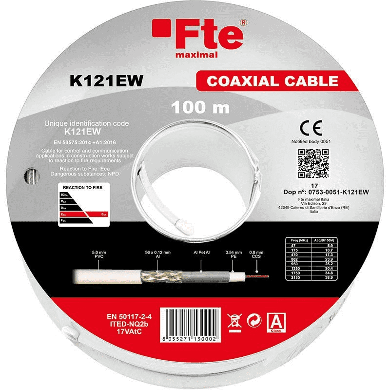 Cavo coassiale TVSAT con conduttore centrale in CCS, sezione da 5 mm in classe A e costruito con le specifiche appropriate per la bassa dispersione di gas tossici in caso d'incendio.