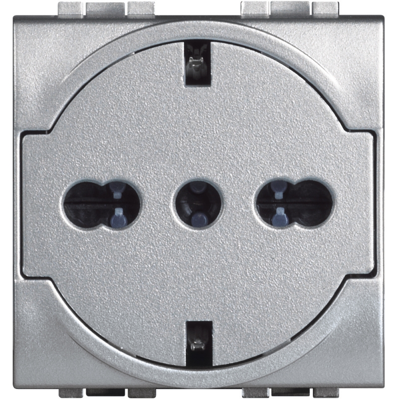 - Presa FLAT standard tedesco e italiano. La superficie della presa, quando la spina viene inserita, scivola all’interno del pozzetto; ritorna in posizione iniziale quando la spina viene estratta. Presa 2 P+T 16 A 250 Va.c. - interasse 19 mm e 26 mm in configurazione bipasso - alveoli protetti; contatti laterali di terra per spine standard tedesco; adatta per: spine standard Italia 2 P e 2 P+T 10/16 A, spine standard tedesco 2 P+T16 A - 2 moduli - Tech