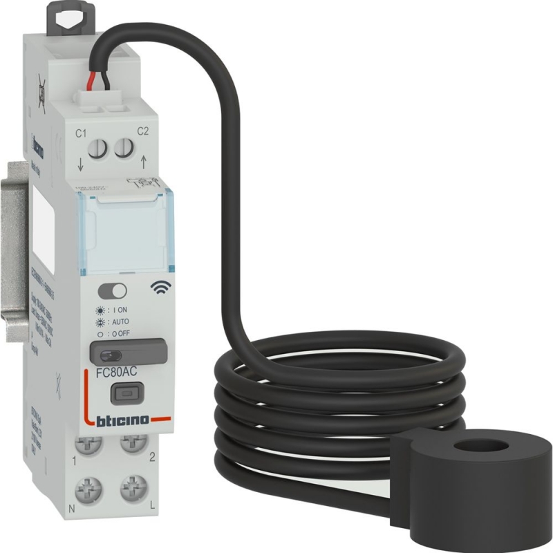 Dispositivo Smart per il comando e la misura dei consumi di apparecchi con assorbimento < 80A dotati di un contatto pulito. Portata 12V/30V d.c. o 230V a.c. 2A max. Ideale per gestire e misurare apparecchi per il riscaldamento, wallbox e colonnine di ricarica veicoli elettrici, sistemi di aerazione, di irrigazione e qualsiasi altro dispositivo dotato di un contatto pulito per il controllo. Non utilizzabile per automazioni di tapparelle. A corredo viene fornito un toroide per la misura della corrente assorbita dal carico max. 80A. Gestione delle funzioni mediante app Home + Control e compatibile con il modulo gestione carichi FC80GCS. Dimensioni 1 modulo DIN. Alimentazione 100-240V a.c. 50/60 Hz.
